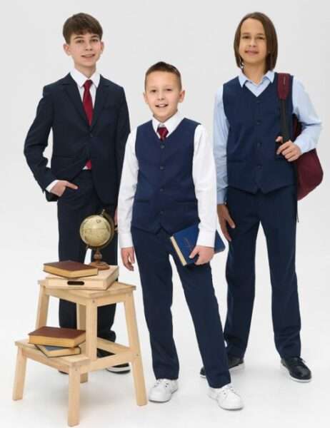 - для мальчиков: синего или черного цвета классические брюки, пиджак, пуловер, БЕЛОГО цвета рубашка (для торжественных мероприятий) или голубая, светло-серая, светло-бежевая (на каждый день);